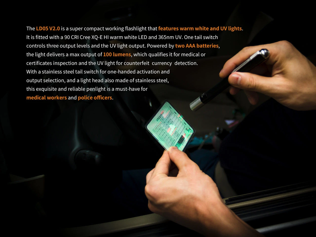 The Fenix LD05 V2.0 EDC Penlight is a easy to use dual lighting source penlight with warm white light and UV lighting also. The all new Fenix LD05 V2.0 uses a 90 CRI CREE XQ-E HI LED and a 365nm UV LED. Operating the Fenix LD05 is simple, the stainless steel tail switch controls all three warm white light outputs and the UV light output. A single click turns the Fenix LD05 on, and half clicks allows you to increase the outputs. The Fenix LD05 V2.0 is powered by two AAA batteries which deliver an amazing 100 Lumens of output. This light is perfect for doctors and dentists as well as helps with medical inspections in low-light areas. The powerful UV light also provide easy detection of counterfeit currency. Get your Fenix LD05 V2.0 today!