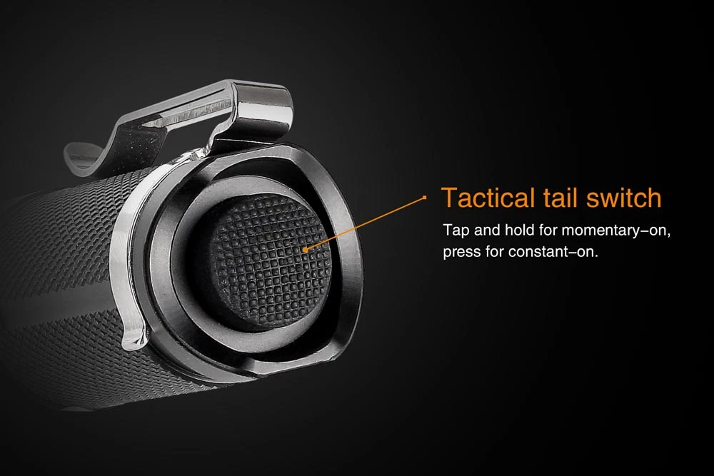 The Fenix PD25 is a powerful, tiny flashlight featuring the latest Cree XP-L LED. This flashlight produces max 550-lumen and 427ft beam distance from a 16340 rechargeable Li-ion battery. The tail cap switch provides momentary-on function while the side switch on the head is for output selection. The Fenix PD25 flashlight is perfect for the outdoors or your every day needs.