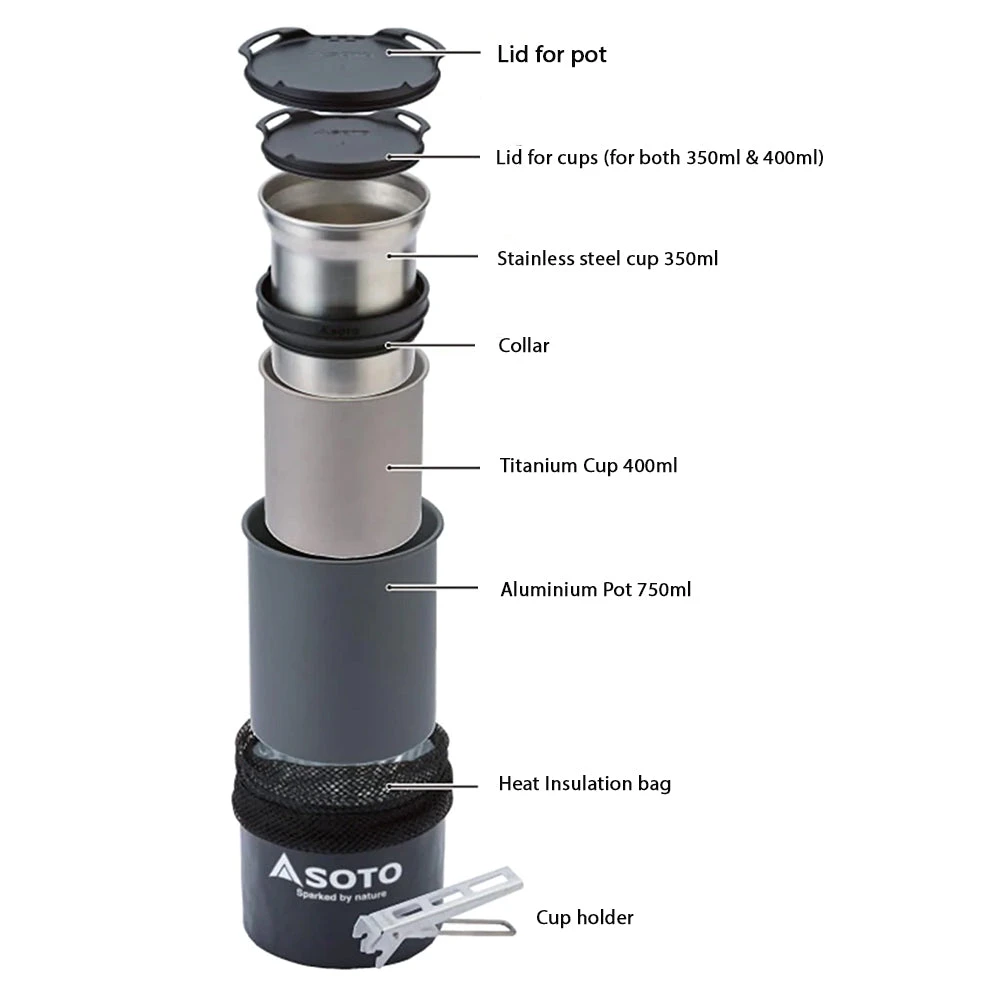 - What’s in the box: 350ml Stainless steel cup x1, 400ml Titanium cup x1, 750ml Mug pot x1, Lid for cups (for both 350ml & 400ml) x1, Lid for pot x1, Lifter x1, Cozy/storage pouch x1